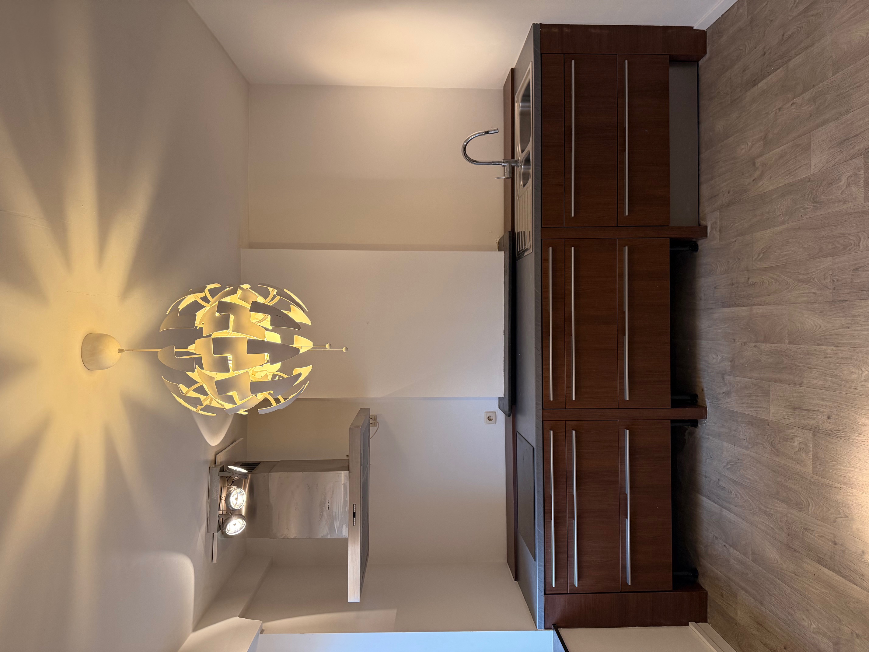 Il se compose d’un séjour avec cuisine ouverte et équipée de rangements bas et hauts, d’un plan de travail, d’un évier double, d’une hotte et d’une taque de cuisson.
