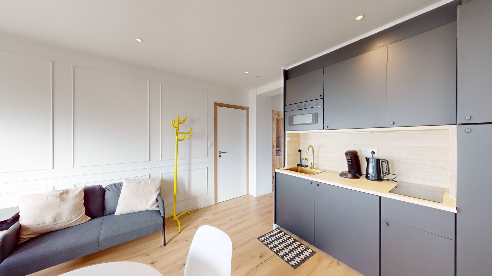 Il se compose d'un séjour, une cuisine, une chambre, une salle de bains équipée d'une baignoire balnéo et d'un sauna.
