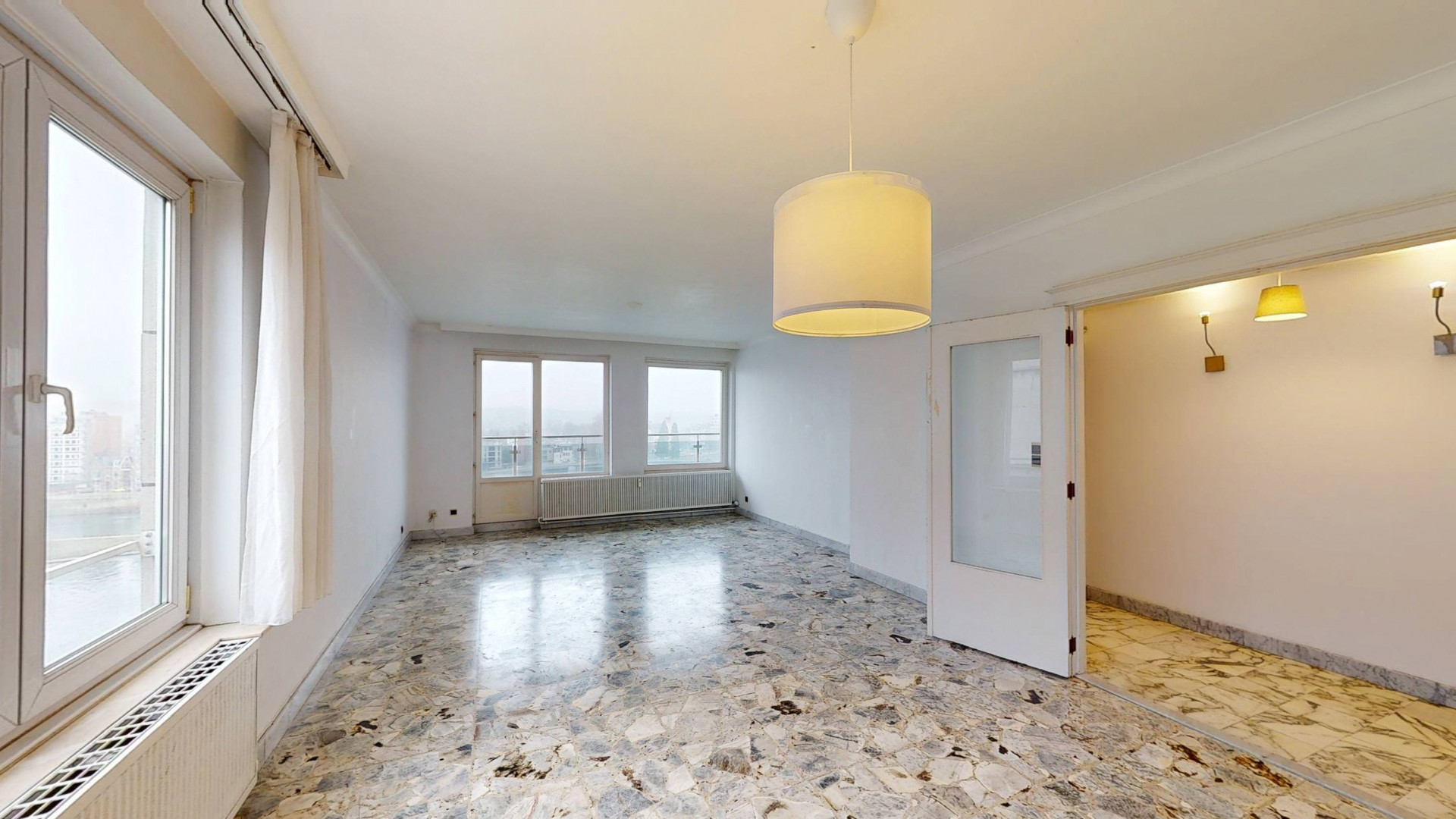 Situé sur l'un des plus beaux quais de Liège, entre la gare des Guillemins et le parc de la Boverie, cet appartement lumineux au 9ᵉ étage d'une résidence avec ascenseur offre un cadre de vie exceptionnel sur le Quai de Rome. Ce bien se compose d'un hall d'entrée, d'un vaste salon/séjour lumineux prolongé par un balcon offrant une vue imprenable sur la Meuse, d'une cuisine séparée, d'un hall de nuit, de trois chambres, d'une salle de bain, d'un WC indépendant ainsi qu'une cave.