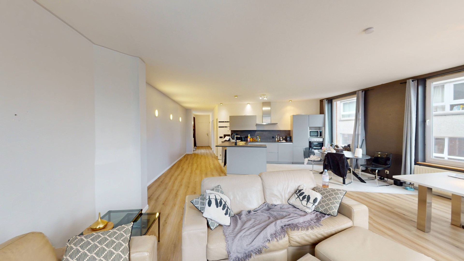 Un vaste séjour de près de 64 m² avec une cuisine équipée et îlot central, un espace salle à manger et un salon lumineux