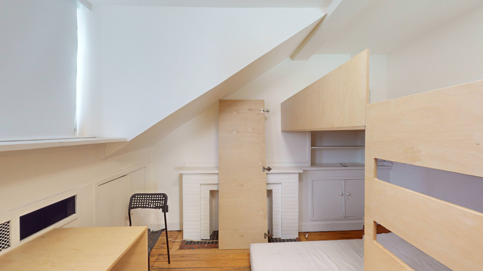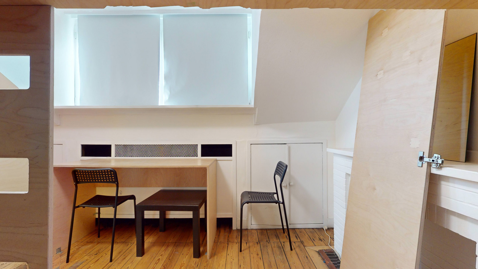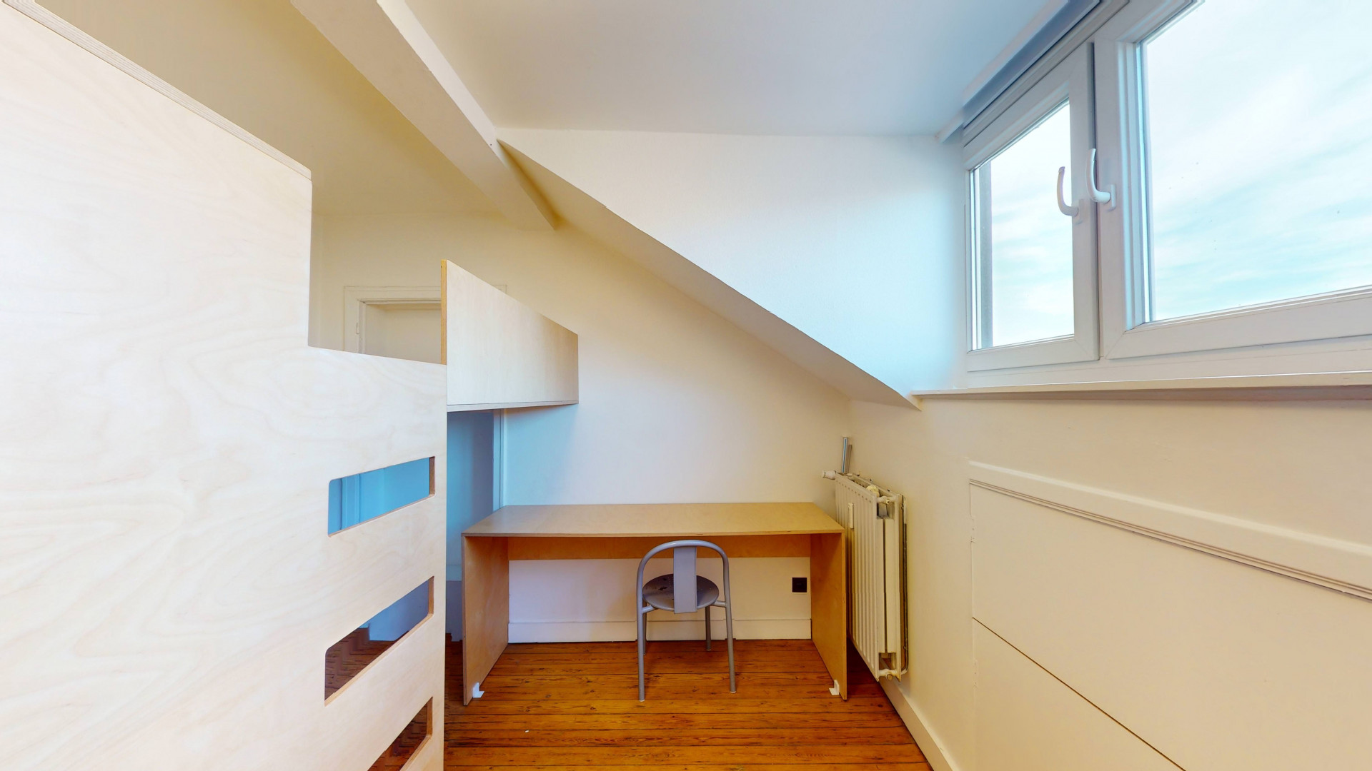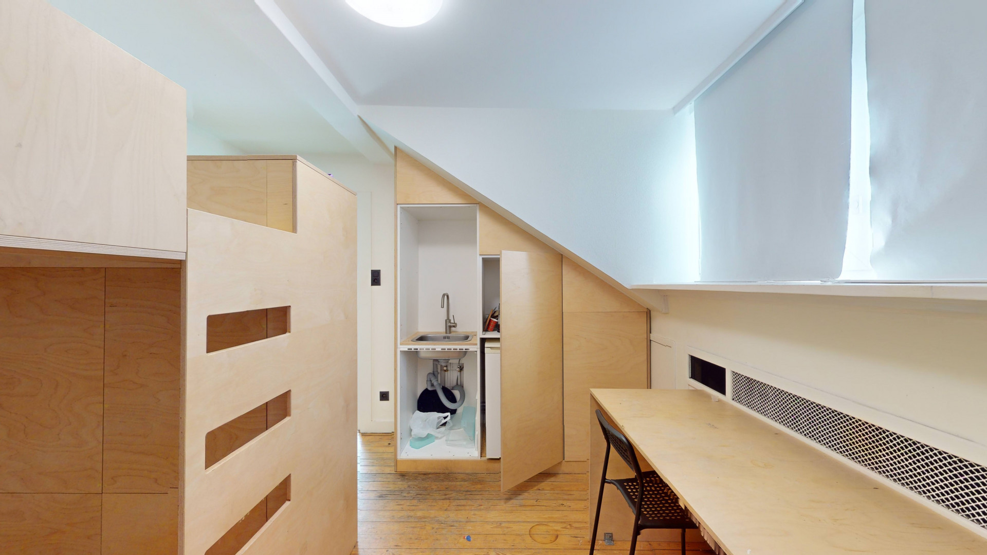 Logements collectifs répartis sur plusieurs niveaux, chambres privatives équipées chacune de douche individuelle, évier privatif, mobilier sur mesure (garde-robe, bureau, lit en mezzanine).