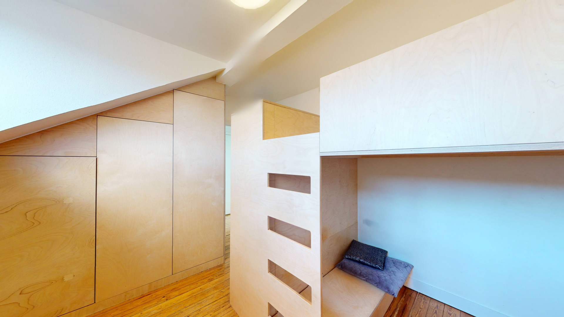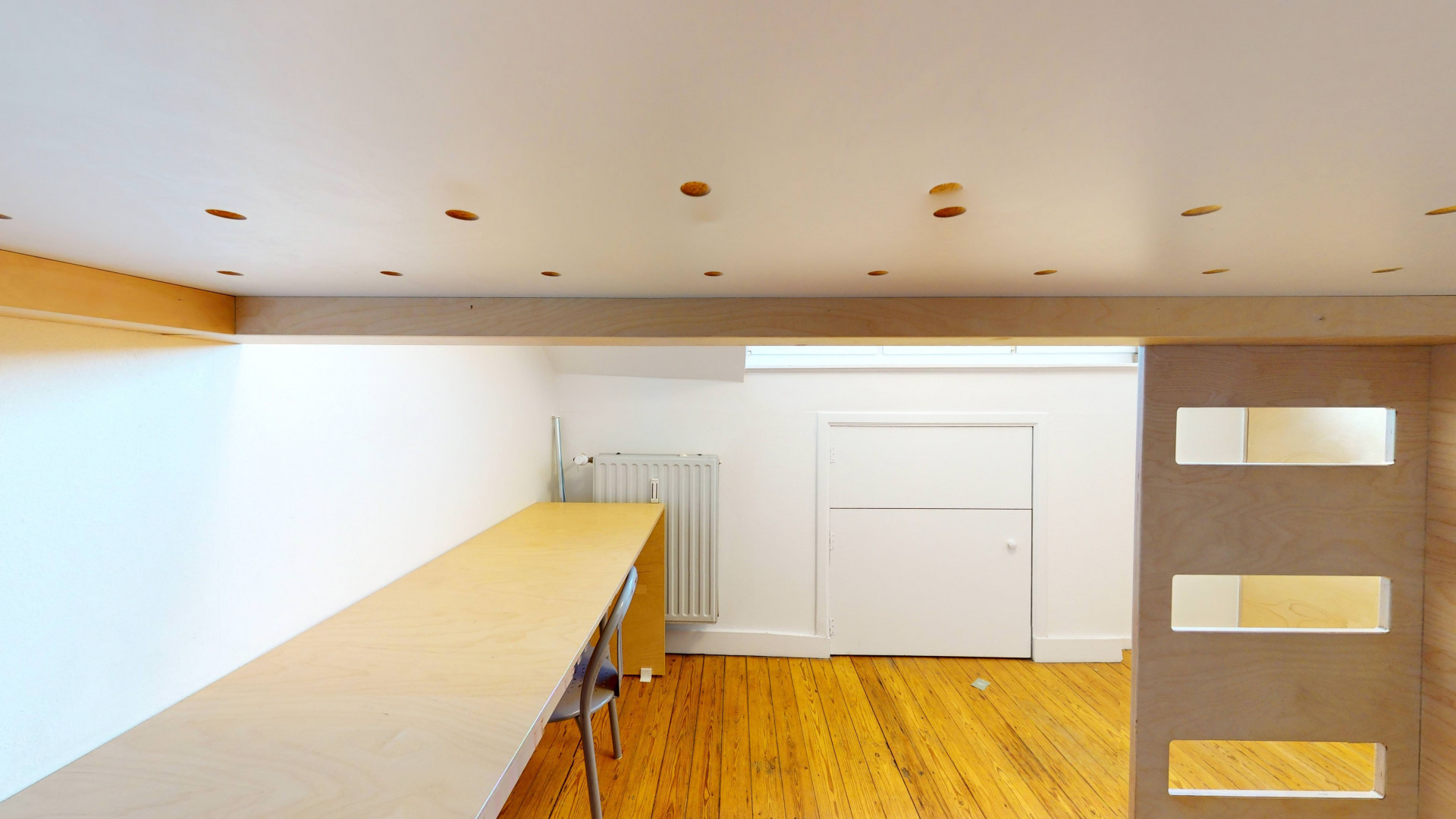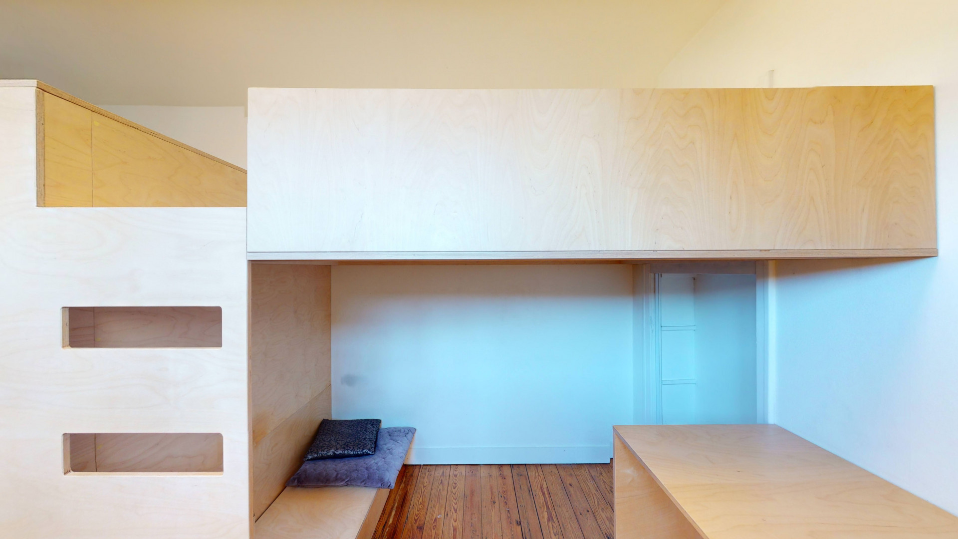 Logements collectifs répartis sur plusieurs niveaux, chambres privatives équipées chacune de douche individuelle, évier privatif, mobilier sur mesure (garde-robe, bureau, lit en mezzanine).