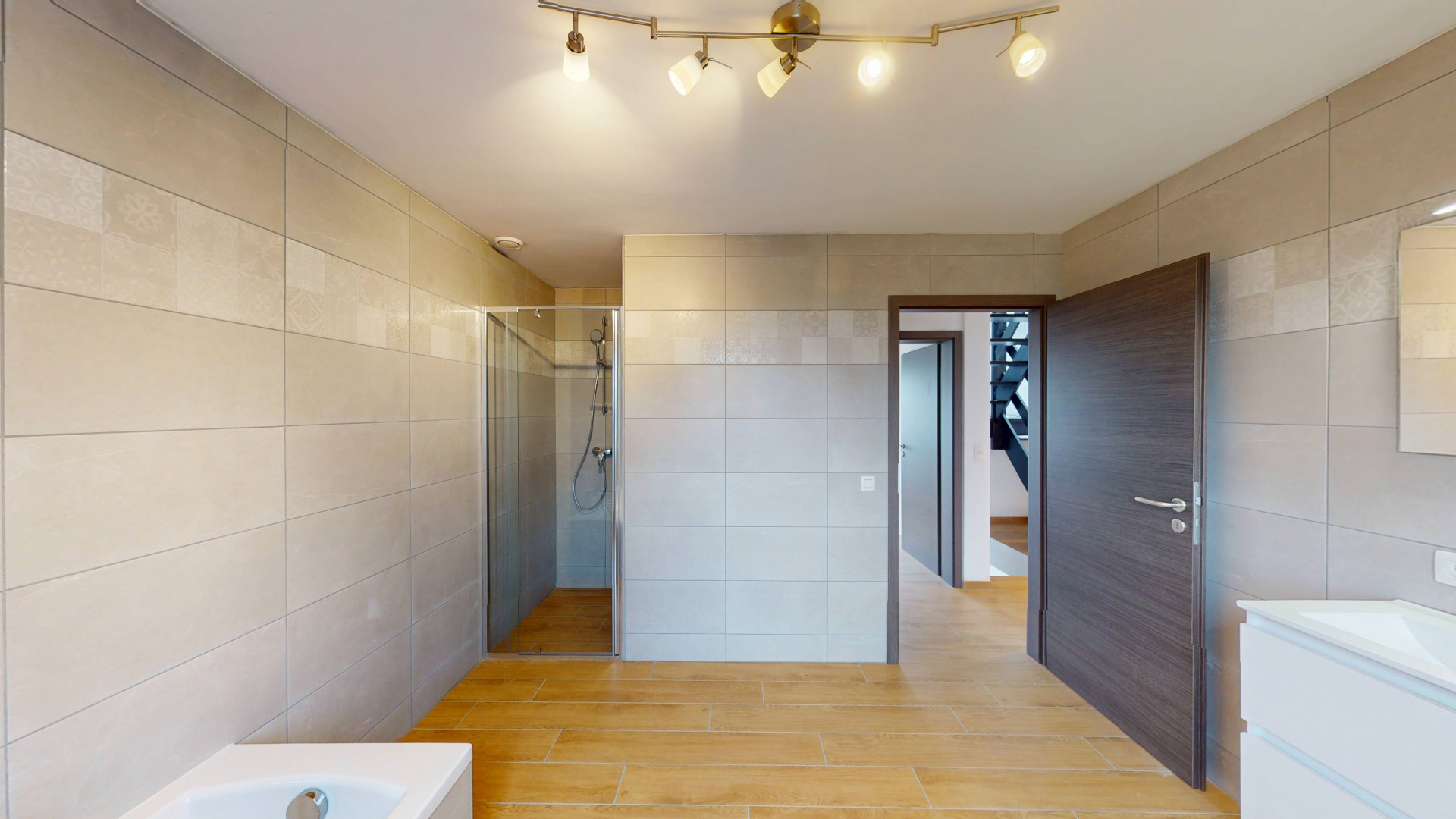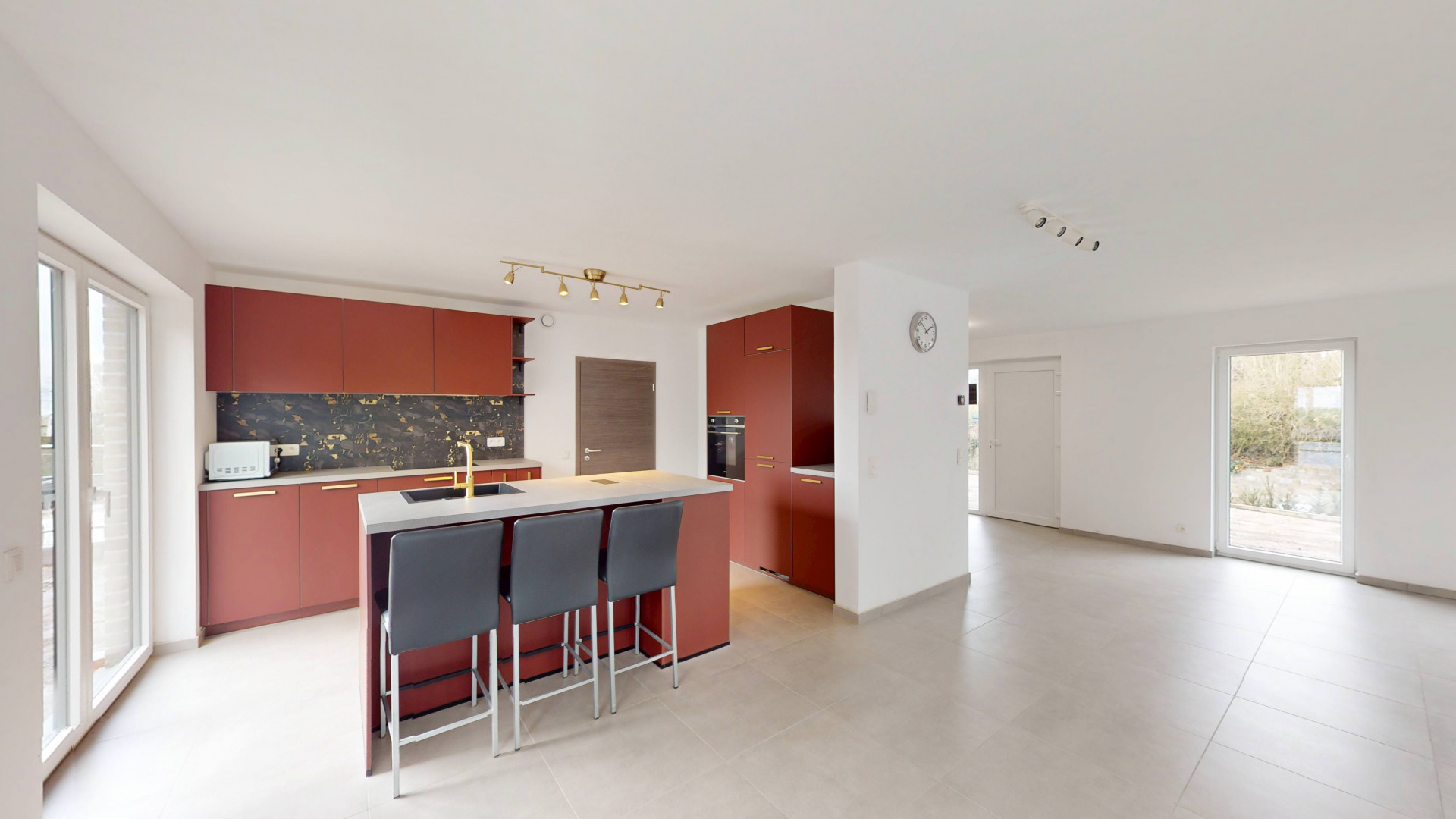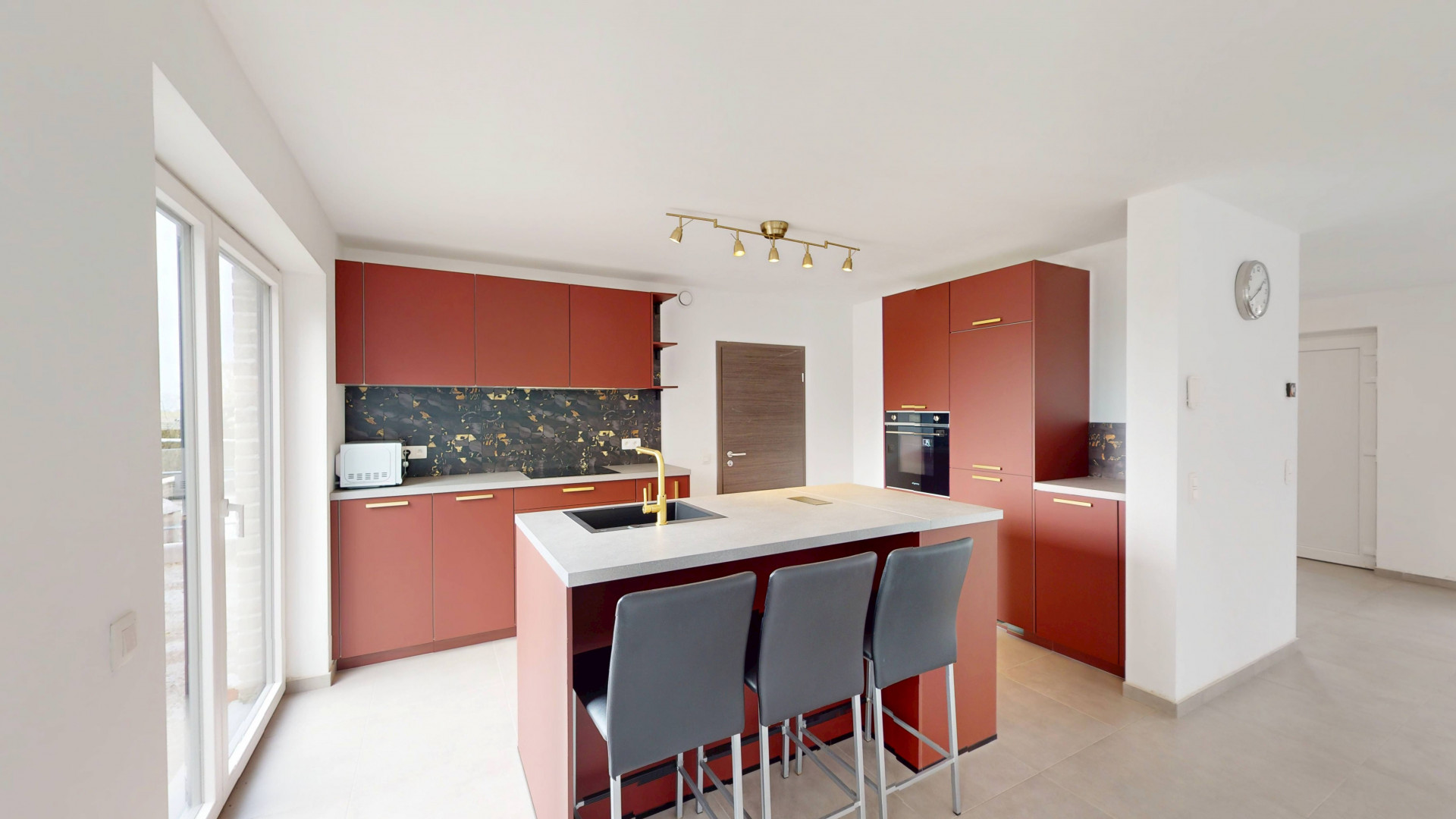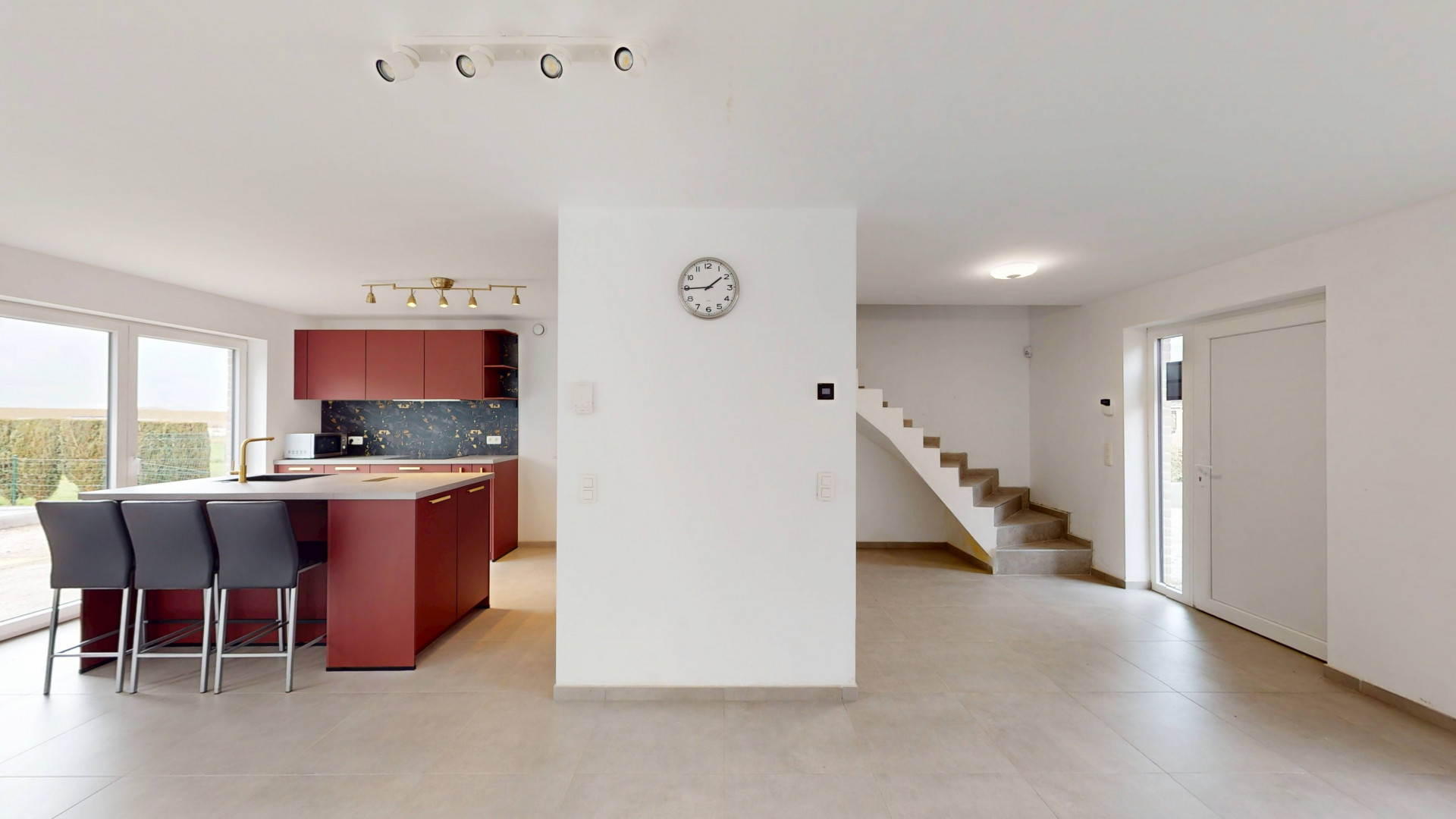 Dès l’entrée, vous découvrez un hall avec WC séparé menant vers un vaste espace de vie lumineux de ±45 m² comprenant salon et salle à manger. La cuisine ouverte moderne avec îlot central constitue un véritable espace convivial. Une buanderie indépendante ainsi qu’une chambre ou bureau au rez-de-chaussée complètent ce niveau.