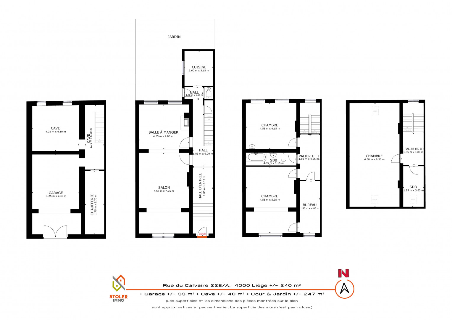 Le bien dispose également d’un garage, de caves spacieuses et d’un extérieur rare en milieu urbain, comprenant une cour et un jardin totalisant environ 247 m².